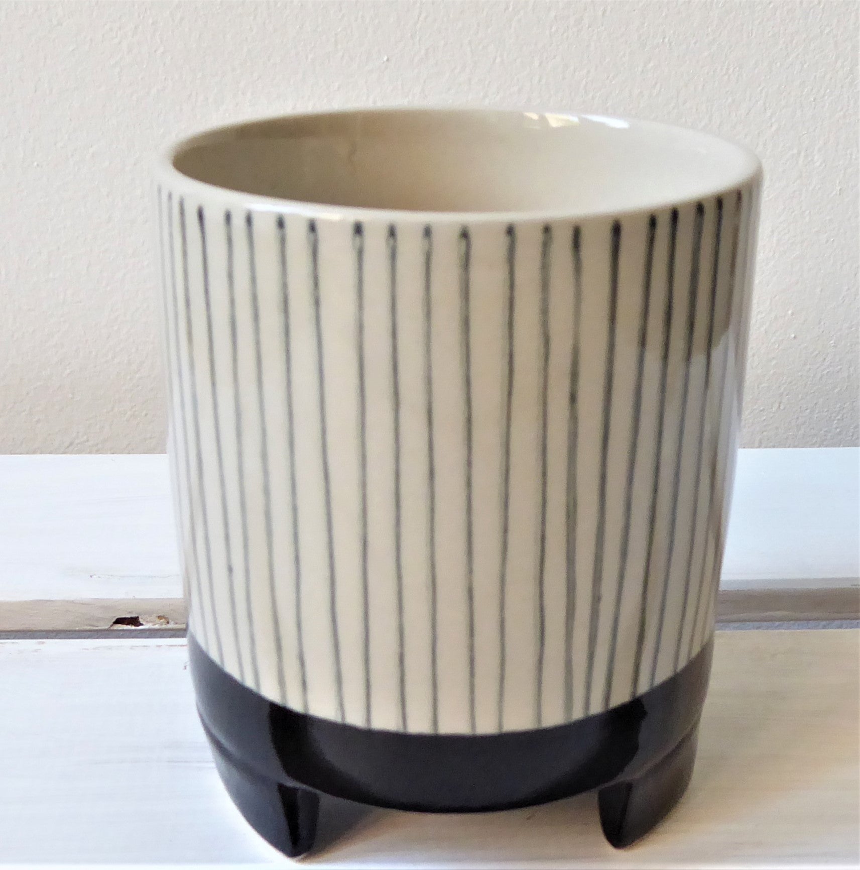 The hand-painted stripes on a neutral background contrast perfectly with the black block colour used for the base and cute legs.