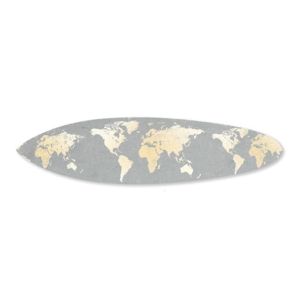 Wooden Surfboard Wall Art with World Map Print, Gray and White