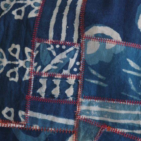 ?printed fabrics using are raw-pieced together onto a backing of recycled cotton fabric with?red ladder stitching. The border and backing is hand woven indigo dyed cotton fabric, with a vintage button closure on the reverse.
