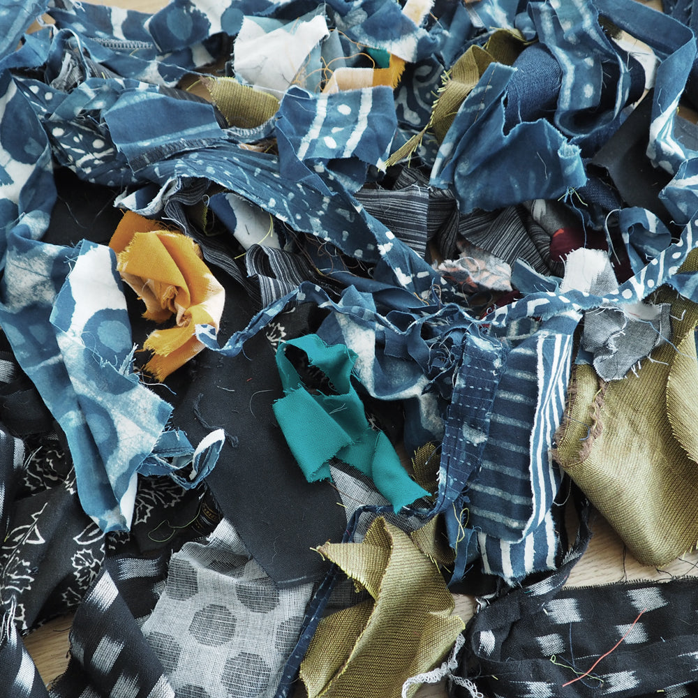 ?printed fabrics using are raw-pieced together onto a backing of recycled cotton fabric with?red ladder stitching. The border and backing is hand woven indigo dyed cotton fabric, with a vintage button closure on the reverse.